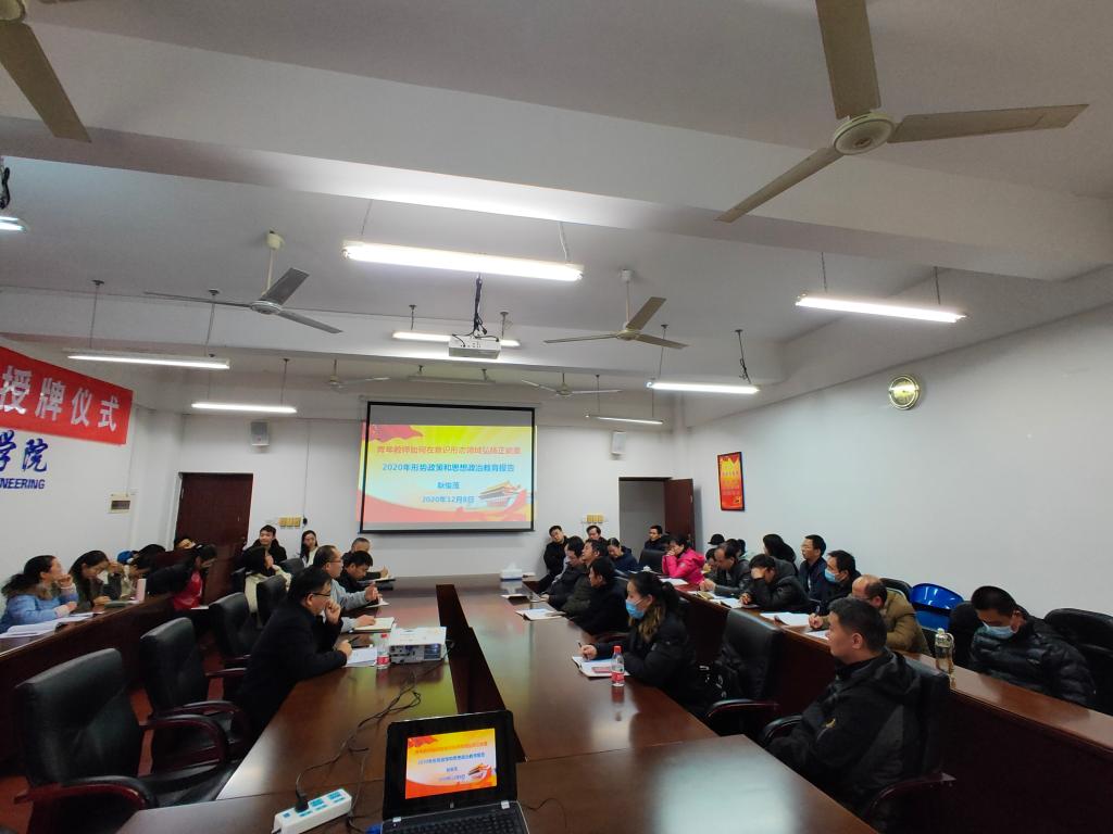 为引导青年教师在教书育人过程中紧扣时代旋律,弘扬正能量,12月8日下午,学院党委书记耿俊茂在07215会议室向全院教职工作2020年形势政策和思想政治教育报告。