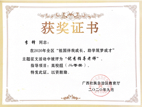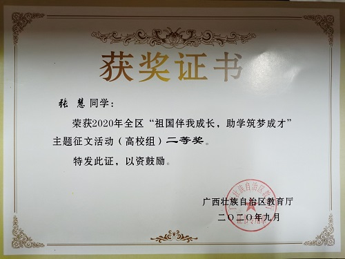 在近期广西教育厅举办的的全区 “祖国伴我成长,助学筑梦成才”主题征文活动活动中,我院自动化专业19-2班张慧同学的文章《忆往昔,春风助力追梦少年》获得全区二等奖,学院李锋老师被评为优秀指导老师。