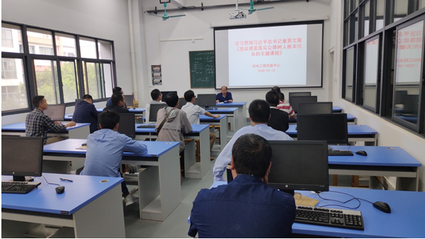 10月13日下午,在金工中心二楼机房,机电工程实验中心组织开展习近平总书记重要文章《思政课是落实立德树人根本任务的关键课程》。由实验中心主任李先瑄老师主持,全体实验中心教职工参加了本次学习。