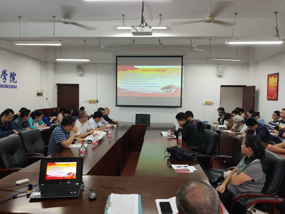 本次教职工理论学习的主题是师德师风建设。耿书记带领大家学习了《习近平在全国高校思想政治工作会议上发表重要讲话》、《教育部关于健全高校师德建设长效机制的意》、《新时代高校教师职业行为十项准则》、《高校教师师德禁行行为“红七条”》和《桂林理工大学关于进一步加强和改进师德师风建设的实施意见》等讲话和文件精神。