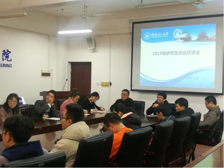 12月31日下午15:00,机械与控制工程学院在雁山校区07215会议室举行了以“欢送2019届研究生”为主题的毕业欢送会,学院党委副书记王迎波,副院长孙旋、导师代表周凯红教授、研究生辅导员张敏、研究生教学秘书耿琳琳出席欢送会。师生欢聚一堂,为机控学院2019届的专硕毕业生送上祝福。