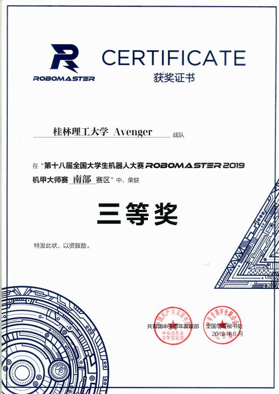 日前,第十八届全国大学生机器人大赛RoboMaster 2019机甲大师赛在广东省佛山市举行。我校由潘祖吉、罗博义、梁海文、覃付豪等29名跨专业跨年级同学组成的Avenger战队在机械与控制工程学院的秦建华、张声岚、韦建毫、周卢婧等4位老师的指导下,夺得全国大学生机器人大赛RoboMaster 2019机甲大师赛南部赛区三等奖的好成绩。同时,还获得机甲大师“工程攀岛取弹”等竞赛项目二等奖2项和英雄机器人等竞赛项目三等奖5项的好成绩。具体获奖一览表如下: