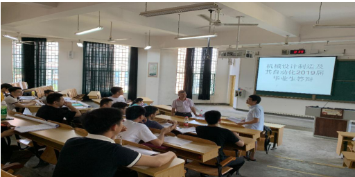 2019年6月3日至6月6日,学院组织机械设计制造及其自动化2019届毕业生进行了毕业设计答辩。本次答辩分为6个小组进行,共有107名毕业生参加了答辩。来自桂林电子科技大学、桂林客车工业集团、桂林大宇客车有限公司的专家受邀加入答辩委员会,答辩委员以学生的毕业论文、设计为主要依据,考察学生四年中掌握的知识、积累的实力。对学生的毕业设计进行审查和评定,并对他们未来的发展提供建议和意见。
