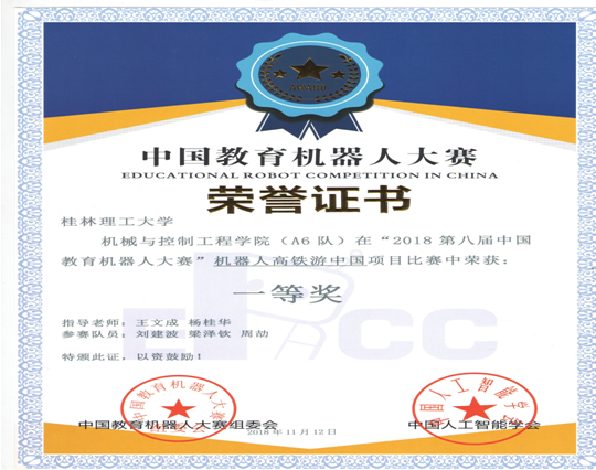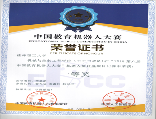 日前,由中国人工智能学会主办的第八届中国教育机器人大赛(ERCC)在桂林电子科技大学北海分校举行全国总决赛,来自全国23个省市的100多所本科院校,1000多名选手集聚一堂,竞技交流。我校机械与控制工程学院师生代表队共组建了12支队伍,分别参加了大学本科组的智能搬运、机器人(高铁)游中国、机器人灭火和救援、机器人擂台对抗、小型家庭服务机器人、智能物流系统等六个项目的比赛,获得了智能搬运一等奖、小型家庭服务机器人一等奖、机器人对抗擂台赛一等奖以及其他项目二等奖的好成绩。