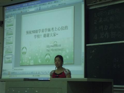 在考研经验交流会上,五位考取研究生的毕业生结合各自备战考研的经验及体会,从复习时间的安排、复习资料的选择、考研的注意事项及自我心态的调整等几个方面与同学们进行了交流,并指出了考研不仅需要合理的安排,更需要有坚定的信念。最后,在互动环节中,在座的同学们非常积极的站起来向毕业生们提问,他们也认真的回答同学们的各类问题,现场气氛热闹。