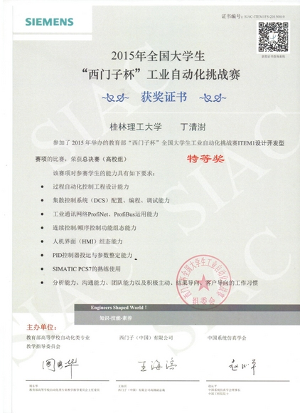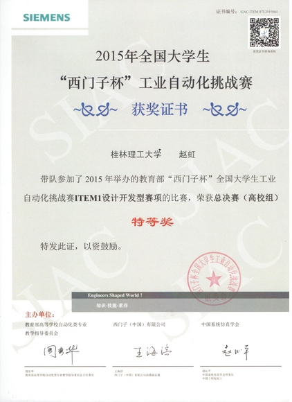 8月25日,2015年全国大学生“西门子杯”工业自动化挑战赛总决赛在北京交通大学圆满落幕。经过紧张激烈的角逐,我校学子取得了高校组的“设计开发”特等奖(“蒸蒸日上”队,学生:丁清澍、余永洋,指导教师:赵虹),“逻辑控制”二等奖(“北门飞雁”队,学生:阳云峰、邱盛云,指导教师:李海侠),以及“运动控制”二等奖(“rock_king”队,学生:罗勤峰、陈庆,指导教师:杨桂华)各1项的好成绩。这也是继上一届我校学子取得一等奖后取得的又一突破性佳绩。