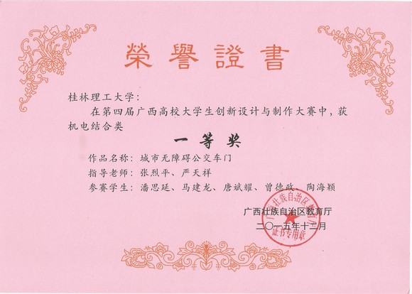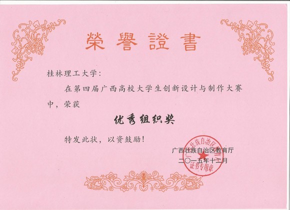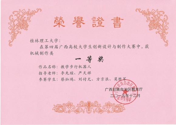 11月中旬,由广西壮族自治区教育厅主办,桂林电子科技大学承办的第四届广西高校大学生创新设计与制作大赛在桂林电子科技大学体育馆落下帷幕。本届比赛共有全区32个高校代表队的284件参赛作品参与了大赛角逐。机械与控制工程学院组队代表我校参加了此次大赛。经过专家的认真评审,我校参赛代表队共获得3个一等奖,4个二等奖和2个三等奖,并获得本届大赛的优秀组织奖。(其中:A组机械制作类获一等奖1个,二等奖3个;B组机电结合类获一等奖1个,二等奖1个,三等奖2个;C组创意设计类获一等奖1个。)
