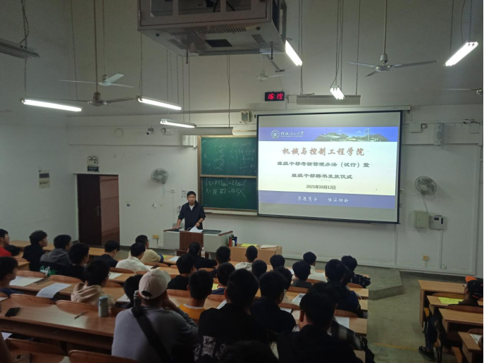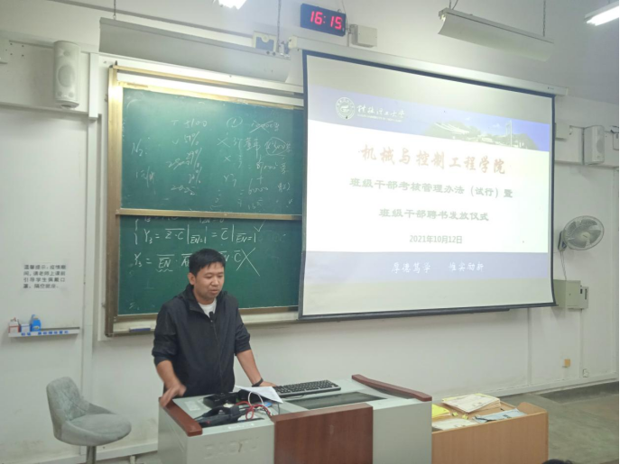 马文硕老师首先简要介绍了《机械与控制工程学院班级干部考核管理办法(试行)》,此班级干部考核管理办法为加强对我院班级干部的培养、管理和使用,充分调动班级干部在工作中的自我教育、自我管理、自我服务的积极性,使我院学生干部朝着有理想、有道德、有文化、有纪律、有能力的目标发展,班级干部考核每学年开展一次,将作为班级干部任用和是否连任的重要依据。