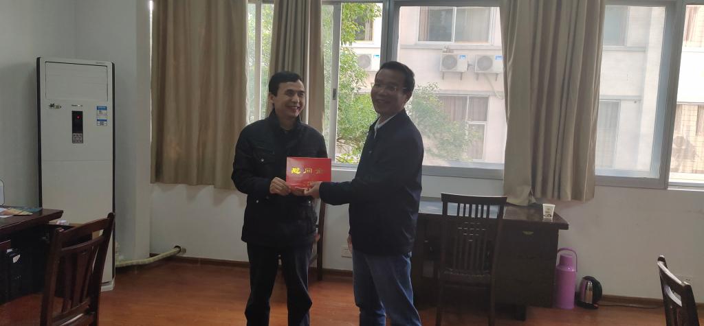2021年12月10日上午,学校党委常委、纪委书记韦学敏在学校纪委监察室副主任叶大相老师的陪同下,到我院走访慰问高层次人才代表刘电霆教授。