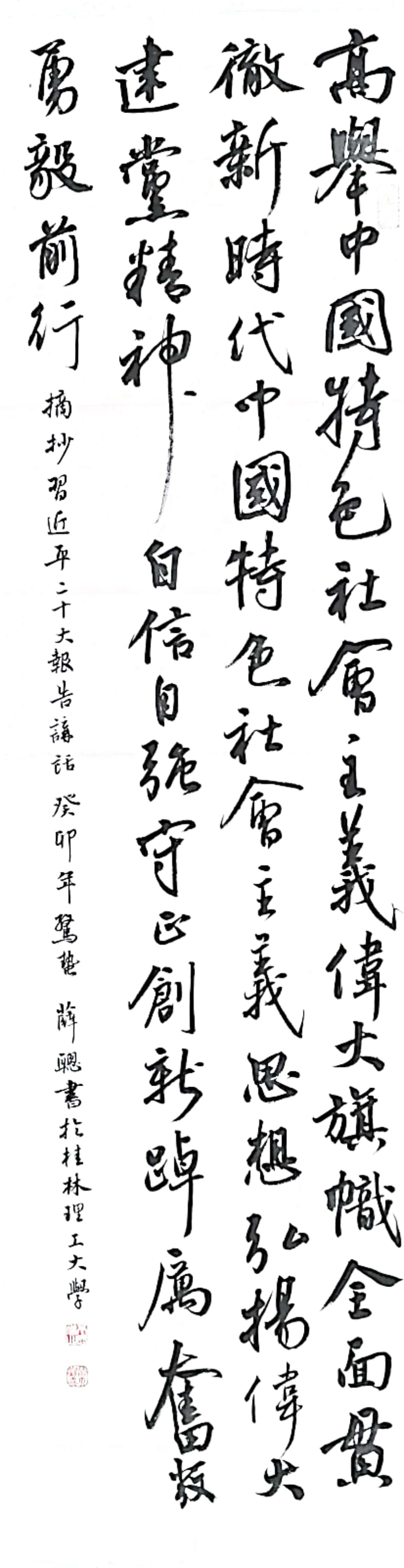 作品简介:喜迎二十大,奋进新征程。为喜迎党的二十大胜利召开,摘抄二十大报告习近平总书记重要讲话,将饱满的热情融入笔端,彰显了爱国情怀,并发扬使命担当,浓墨重彩地展现了中国共产党的光辉历史和丰功伟绩。学习的道路永无止境,路漫漫其修远兮,吾将上下而求索,新时达青年将不忘初心、牢记使命、砥砺奋进,为铸建人类命运共同体伟大工程添砖加瓦,继承创新发扬优秀的传统文化,弘道坚毅而行。