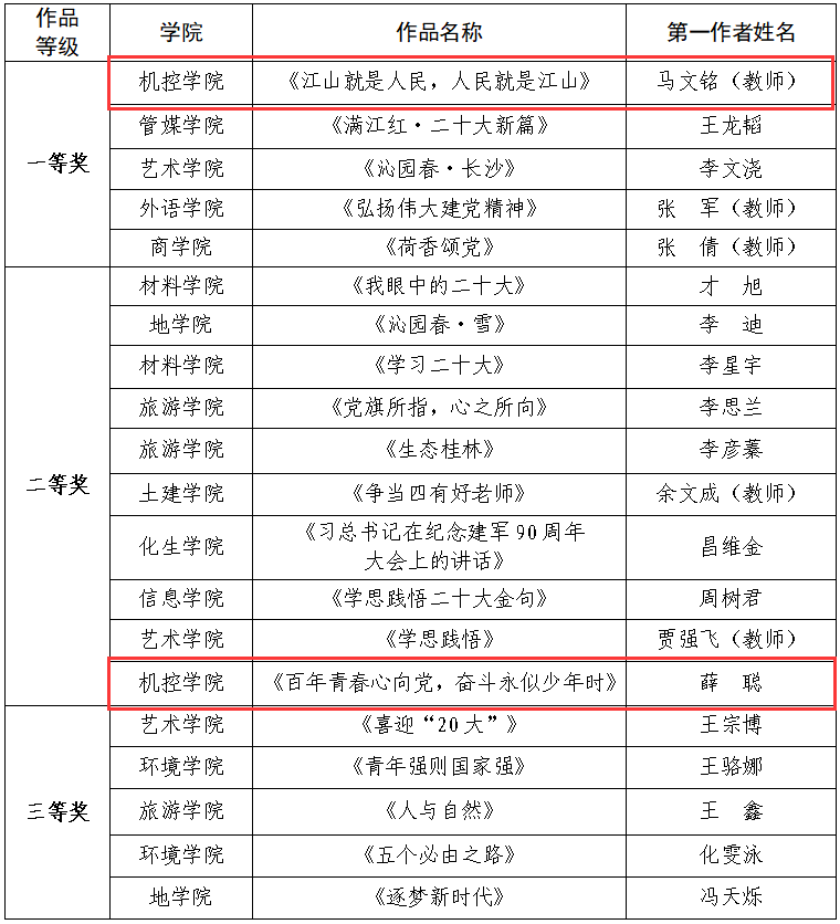 据了解,此次大赛为深入学习宣传贯彻习近平新时代中国特色社会主义思想,推动党的二十大精神入脑入心、走深走实,切实营造文明健康、积极向上的校园文化氛围,提高学校教师与学生艺术创作积极性,在广大师生中积极征集作品,经评委会综合评审,最终评选出一等奖5名,二等奖10名,三等奖15名。学院选送的《江山就是人民,人民就是江山》、《百年青春心向党,奋斗永似少年时》两部作品分别荣获此次比赛一等奖和二等奖。