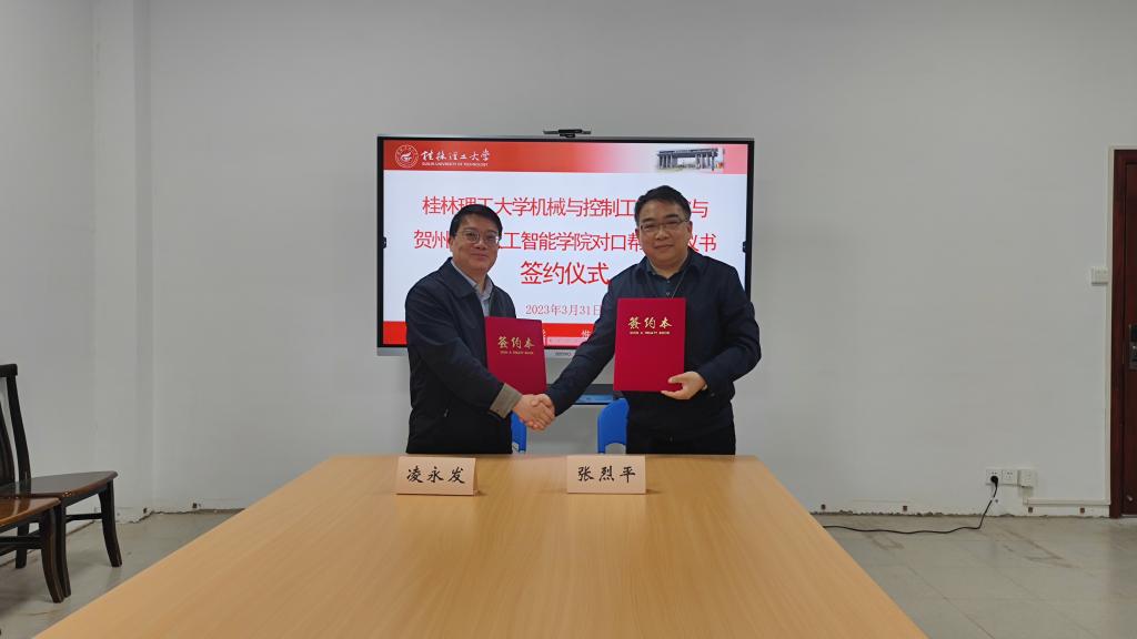 最后,贺州学院人工智能学院院长凌永发和张烈平院长签订了“机械与控制工程学院对口支援贺州学院人工智能学院”协议书。对口支援协议书的签订对双方在人才培养、教师能力提升、访学培训、挂职锻炼以及学生考研、学科竞赛给予了大力支持和帮扶。