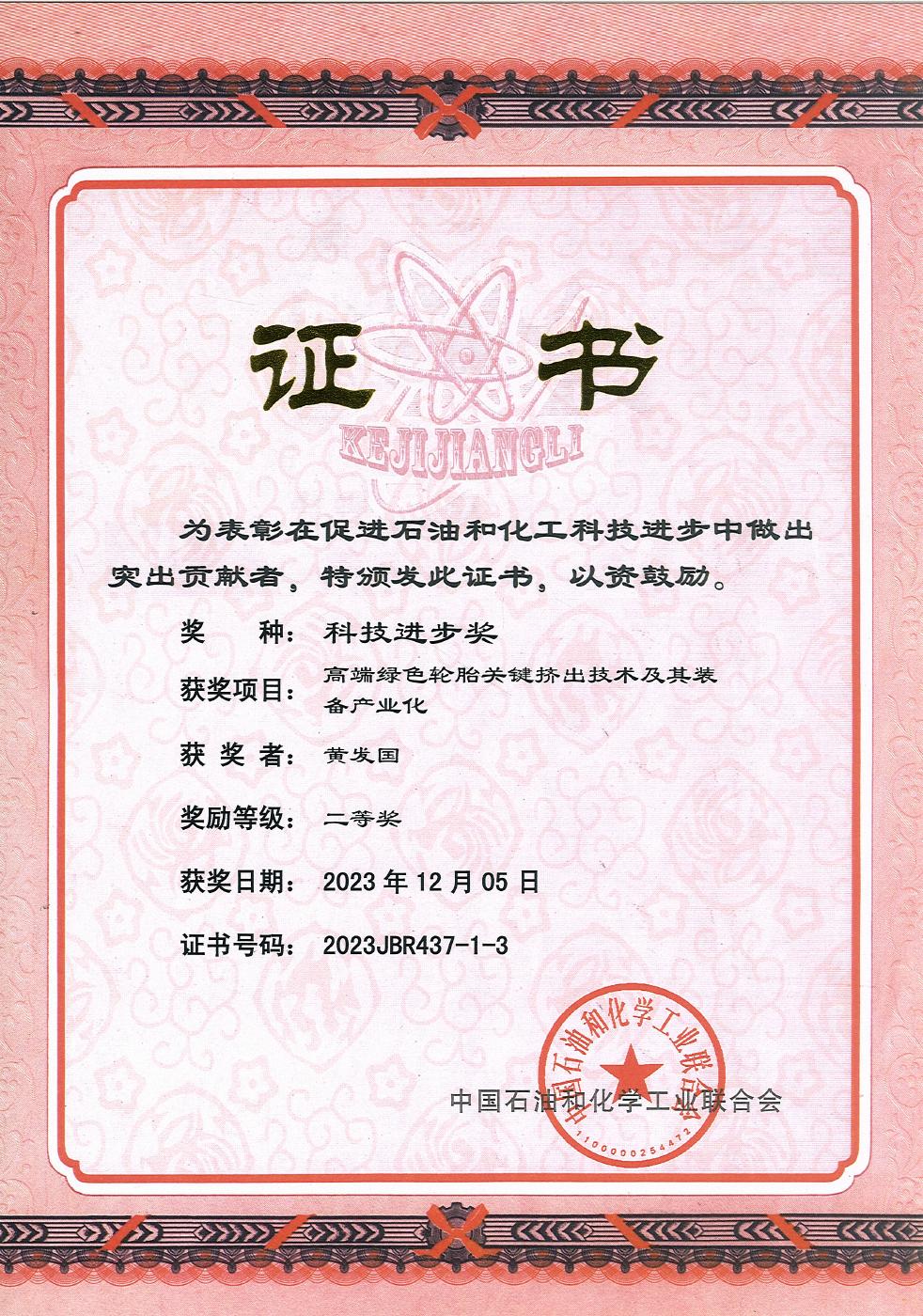 学院黄发国教授、潘家芳教授作为主要参与人,学校作为第二完成单位与桂林橡胶设计院有限公司联合申报的“高端绿色轮胎关键挤出技术及其装备产业化”项目获得中国石油和化学工业联合会科技进步奖二等奖。