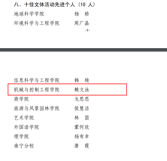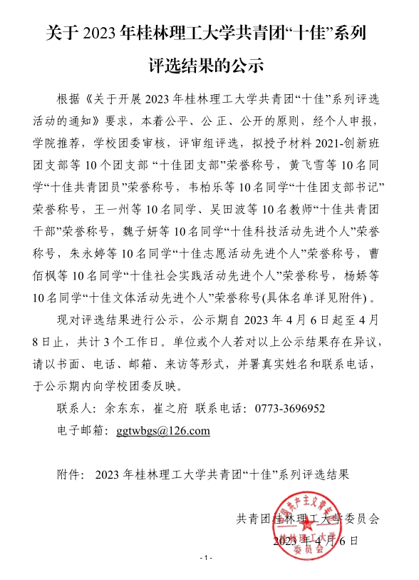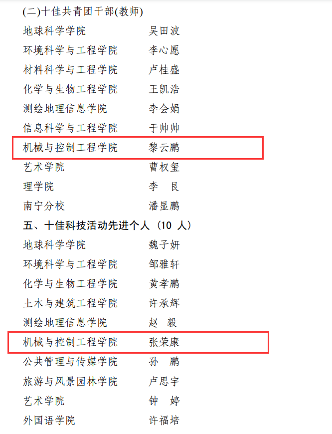 近日,在学校公布的《关于2023年桂林理工大学共青团“十佳”系列评选结果的公示》评选结果中,我院团委书记黎云鹏荣获“十佳共青团干部(教师)”、自动化2021-1班团支部荣获“十佳团支部”、2019级学生张荣康荣获“十佳科技活动先进个人”、2020级学生麻军英荣获“十佳共青团员”、2020级学生赖文泳荣获“十佳文体活动先进个人”。