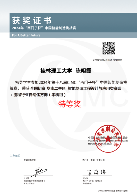 教育部2024年第十八届CIMC“西门子杯”中国智能制造挑战赛各赛项已于暑期在全国各分赛区陆续进行。在本届大赛中,我院教师陈明霞指导的由我院本科生周家鑫、研究生严一踔组成的参赛队伍获得了智能制造工程设计与应用类赛项:流程行业自动化方向(本科组)的分赛区特等奖,另还有5支参赛队获得不同赛项的分赛区一等奖1项、分赛区二等奖2项、分赛区三等奖2项。