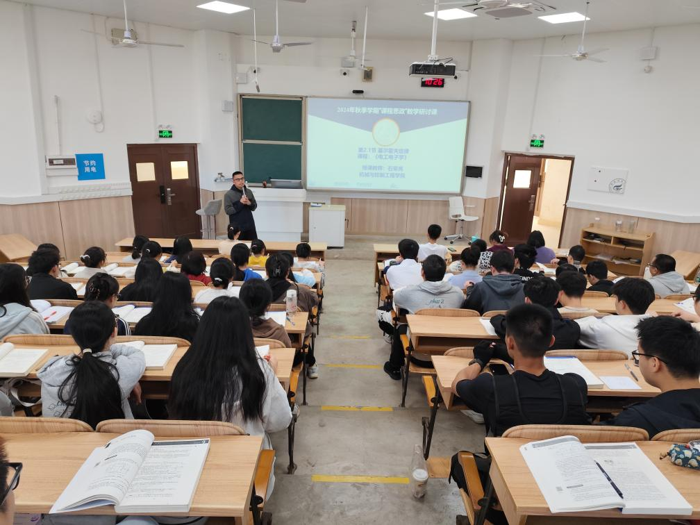 为学习贯彻习近平总书记在学校思政课教师座谈会上的重要讲话精神,全面落实立德树人根本任务,进一步落实专业核心课程思政建设,提升专业课程的教学效果,11月19日上午,我院自动化教研室在07319D组织开展“课程思政”研讨课教学活动,石荣亮老师开展了《电工电子学》课程思政研讨课,教研室组织教师参加了听课与讨论。