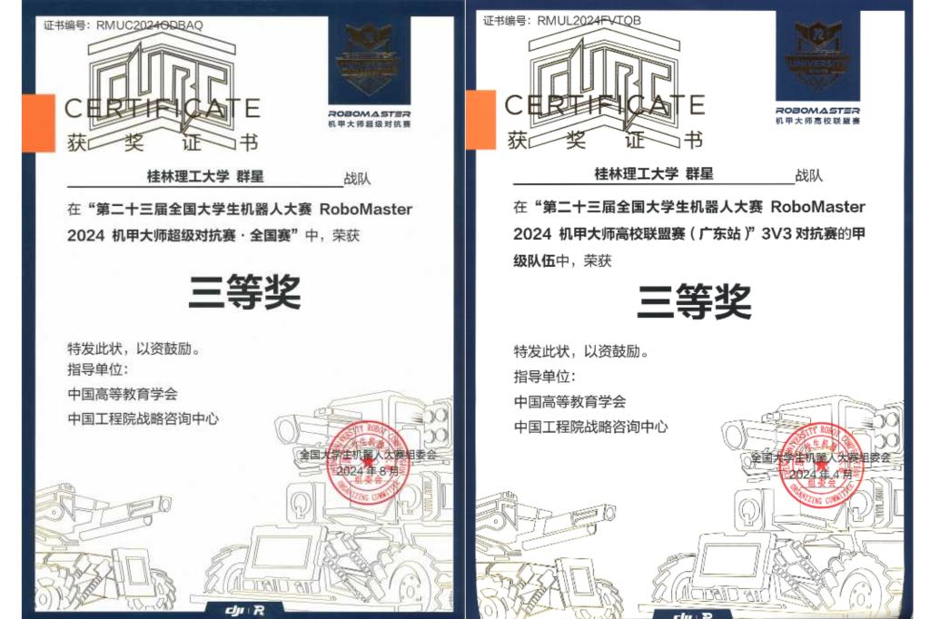 近日,由大疆公司主办的“第二十四届全国大学生机器人大赛RoboMaster2024机甲大师高校联盟赛”与“第二十四届全国大学生机器人大赛RoboMaster2024机甲大师超级对抗赛”圆满结束。桂林理工大学机械与控制工程学院的群星战队在此次比赛中表现出色,荣获多项殊荣,再次展示了桂林理工大学在机器人技术研发和竞赛领域的卓越实力。