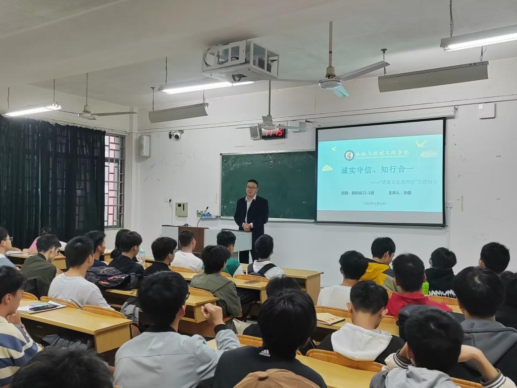 为进一步推进清廉班级建设,将清廉文化、诚信文化融入班级建设,打造学风优良的班级,实现学生崇尚清廉、成才有为,6月3日-6日期间,机械与控制工程学院组织全院所有班级以“廉洁文化班级”——诚实守信,知行合一为主题,同上一堂主题班会课。