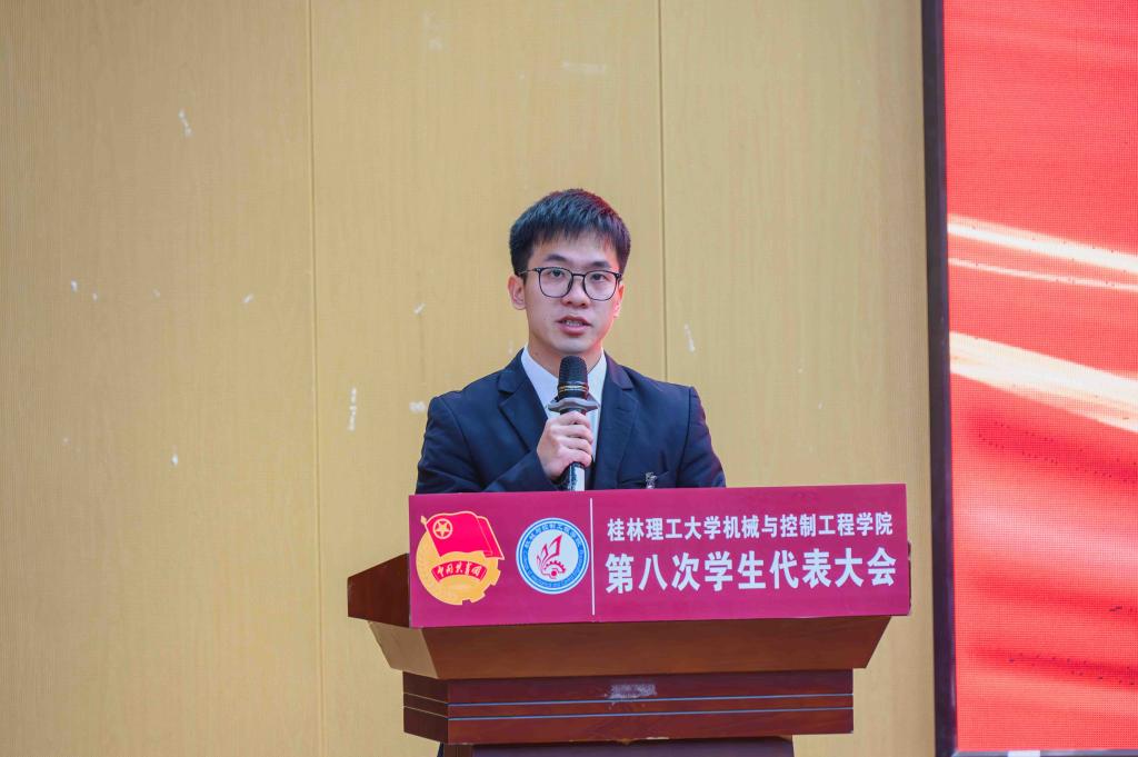 为着力发挥学院团委思想引领作用,不断强化提升青年学生政治性、先进性,2024年12月27日,机械与控制工程学院第八次学生代表大会在雁山校区图书馆报告厅召开。学院党委书记耿俊茂、学校创新创业学院副院长唐红兵、学院党委副书记王迎波、副院长代宣军、团委书记黎云鹏、团委副书记刘威、校学生会代表黄天池、机控学院全体师生代表参与本次会议。大会由学院第七届学生会执行主席古振华同学主持。