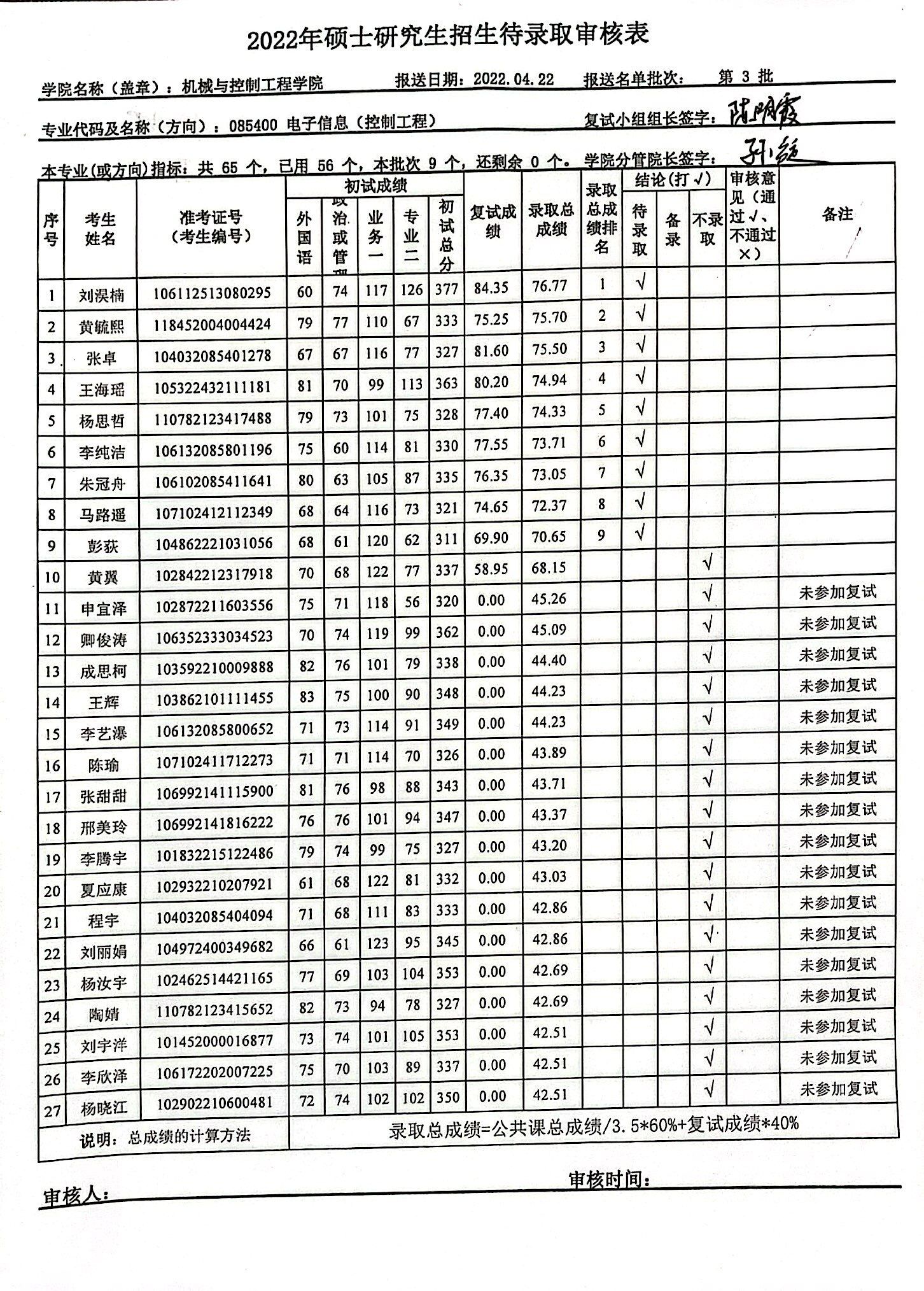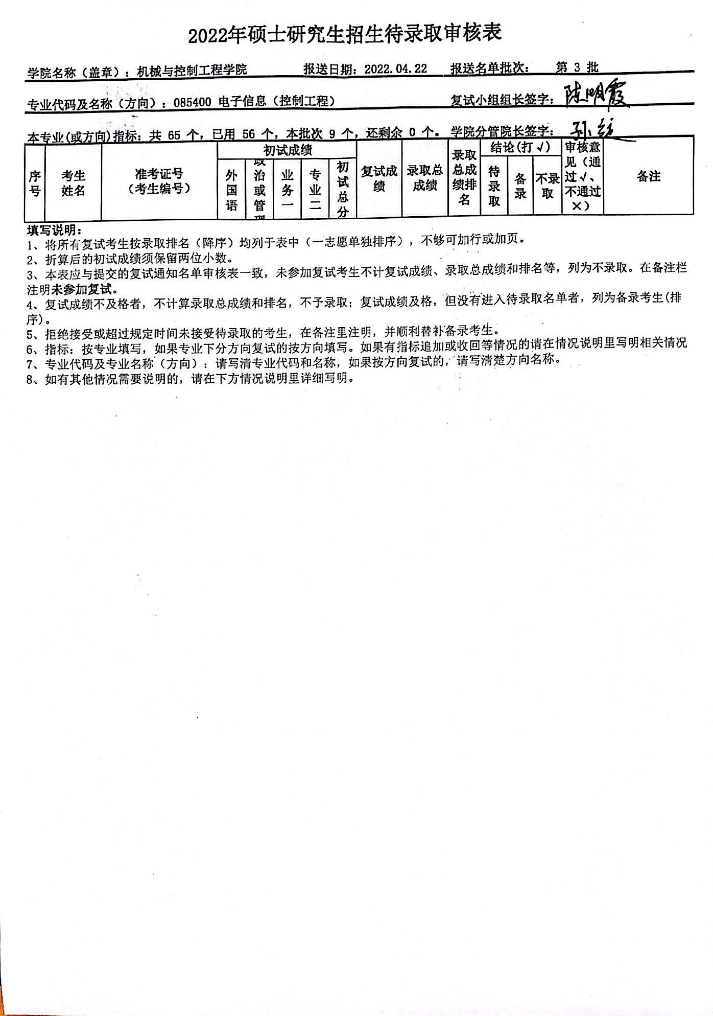 2022年机控学院研究生招生电子信息(控制工程)调剂复试待录取学生名单