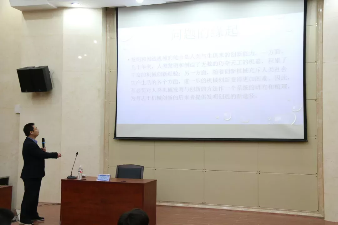 讲座开始,周老师首先提出,在机械创新越来越困难的今天,有必要对现有的机械发明与创新方法做系统的研究和梳理,为有志于机械创新的后来者提供发明创新的新途径,然后从机械创新的定义、动力和方法三个方面进行了讲解。