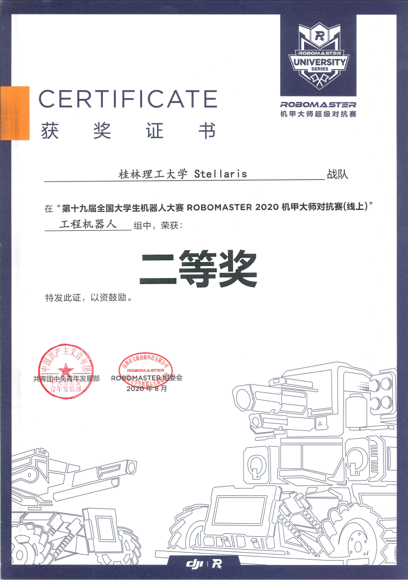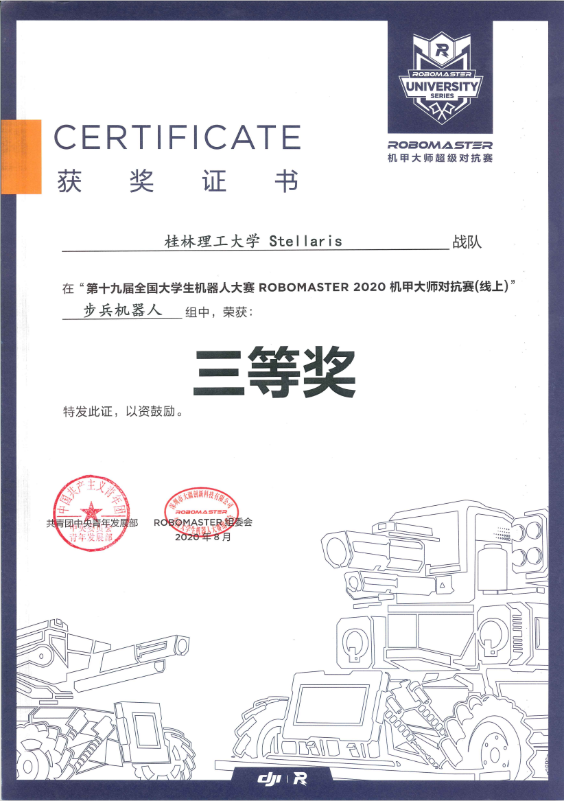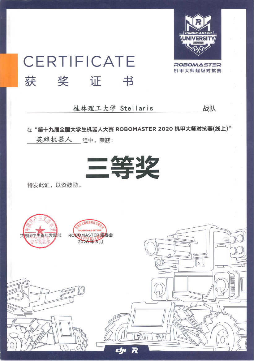 但是,在如此艰难的情况下,Stellaris战队的参赛热情并未受到影响。经过一年的辛苦备战,在秦建华,张声岚,韦建豪,周卢婧,黄鹏等老师的指导下,Stellaris战队不畏艰险,成功夺得第十九届全国大学生机器人大赛RoboMaster 2020机甲大师赛(线上)一等奖一项,二等奖两项,三等奖四项的好成绩,具体获奖情况如下: