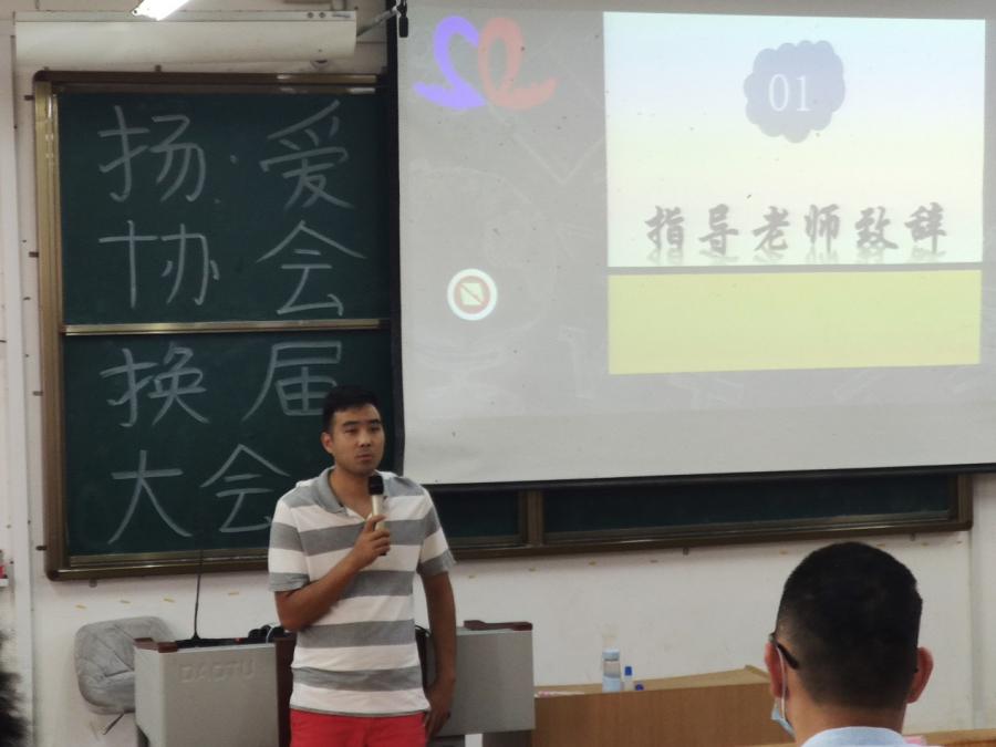 大会以ppt播放回忆录拉开序幕,紧接着协会指导老师李锋和协会会长徐梦婷同学分别发表讲话,总结前期工作,对近期工作提出建议和意见,并对即将竞选新一届领导成员的协会成员们表示鼓励,表示对扬·爱协会今后的发展寄予厚望。李老师的讲话,使大家都深刻感受到学院对扬爱协会的支持与鼓励,明白了身上艰巨的任务。大家纷纷表示要在今后的工作中,精诚合作,不断努力,共同为扬·爱协会的明天奋斗。