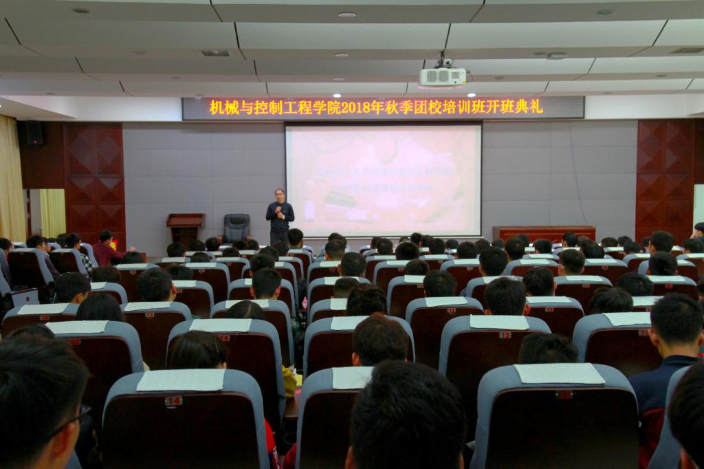 2018年10月24日晚,机械与控制工程学院于一栋报告厅01501召开了2018年秋季团校培训开班典礼,出席本次开班典礼的有院党委副书记耿俊茂,学院团委书记刘颖洁、团委学生会全体学生干部以及各年级班委;学院易班新媒体中心、机器人基地、科技协会、心理协会、扬爱协会等组织学生干部,共计160余人。开班典礼在中国共青团团歌的全体奏唱下召开.