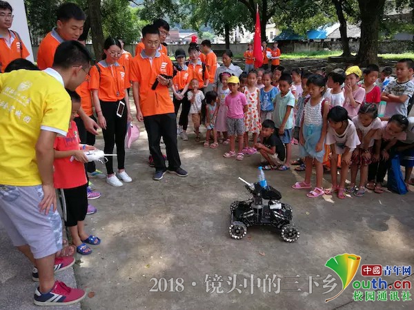 实践团成员亲手教孩子们操作机器人战车,小朋友们的目光被机器人战车吸引。中国青年网通讯员 杨锡坚 摄