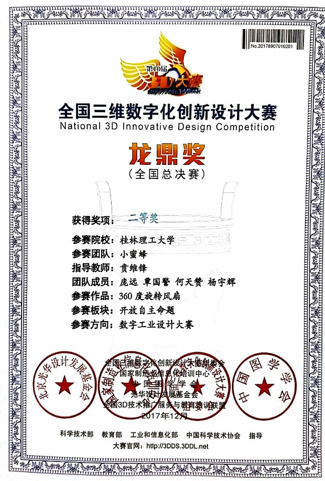 由学院贲维锋老师指导的“小蜜蜂”团队作品《360度旋转风扇》作品荣获二等奖,学院代宣军、黎云鹏老师指导的“逸飞”团队作品《桥式千斤顶》荣获三等奖,同时“逸飞”团队在“3D数字化设计大师之路-现场绘图擂台赛”上勇夺擂台赛冠军。