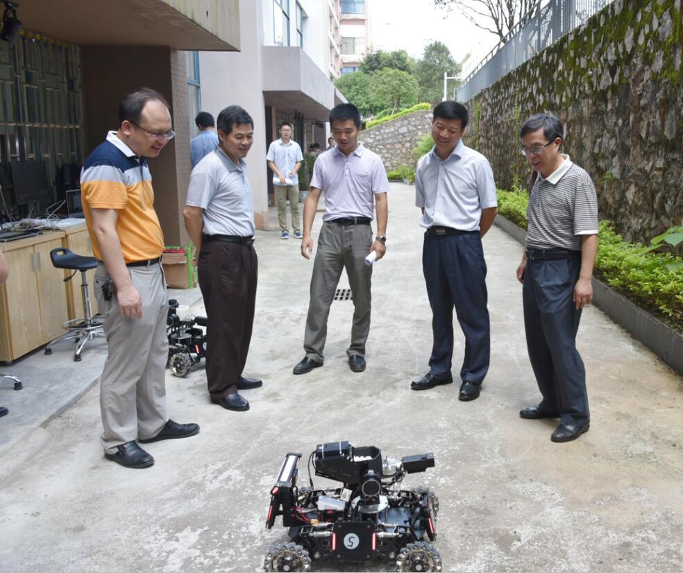 解校长一行参观了我院机器人创新实践基地,与今年将代表我校参加RoboMasters全国大学生机器人总决赛的团队进行交流,详细了解了机器人大赛的比赛规则、组队情况以及准备情况,对同学们在分区赛中取得的优异成绩表示充分肯定。机器人大赛团队学生负责人曹鹏向解校长一行详细讲解并演示了即将参赛的机器人战车,解校长就作品的创新点、操作方法、创作思路和应用价值等问题进行了询问,预祝同学们在即将到来的全国总决赛中取得更好成绩,为学校争光。此外,解校长还要求相关部门做好各项服务保障工作、为参赛师生提供良好的备赛环境。