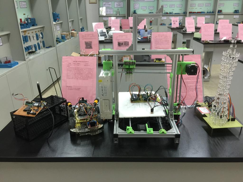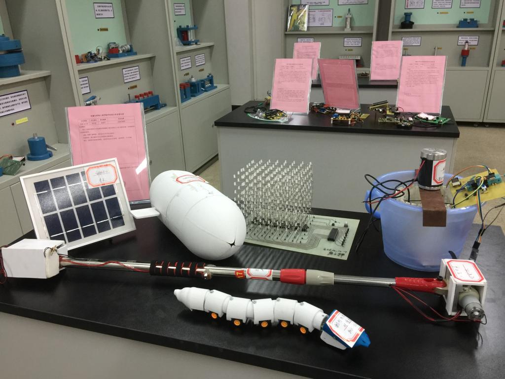 本次展出作品包括“基于STC89C52的夜间行车预警系统”、“基于单片机的公交车燃爆应急处理系统”、“基于单片机控制的智能捕鼠器”、“基于无线传感网络的室内灯光控制系统”、“基于PLC的汽车轮毂跳动检测系统”、“便捷式甘蔗刀结构设计与研制”、“3D打印蛇形机器人模型设计与实现”、和“机器鱼模型设计与实现”等,涉及单片机控制、PLC控制、无线通信、3D打印、机械设计等多个领域。