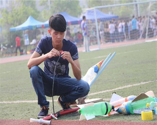 9点30分许,比赛正式开始。参赛选手们事先利用废旧的可乐瓶、木塞、打气筒等简单的工具,制作出了一个个造型别致的“水火箭”。在工作人员的组织带领下,参赛人员有序签到进入赛场。同学们三人一组,分工明确,有序地给水火箭灌水,塞上塞子,放上架子,打气等...伴随着一声巨响,“水火箭”从操场上腾空而起,火箭一飞冲天,引起现场观众接连不断的欢呼声。大家热情高涨,比赛进行得如火如荼,最远记录也不断被刷新......经过激烈角逐,机械14-3农源鸿获得了本次比赛一等奖。