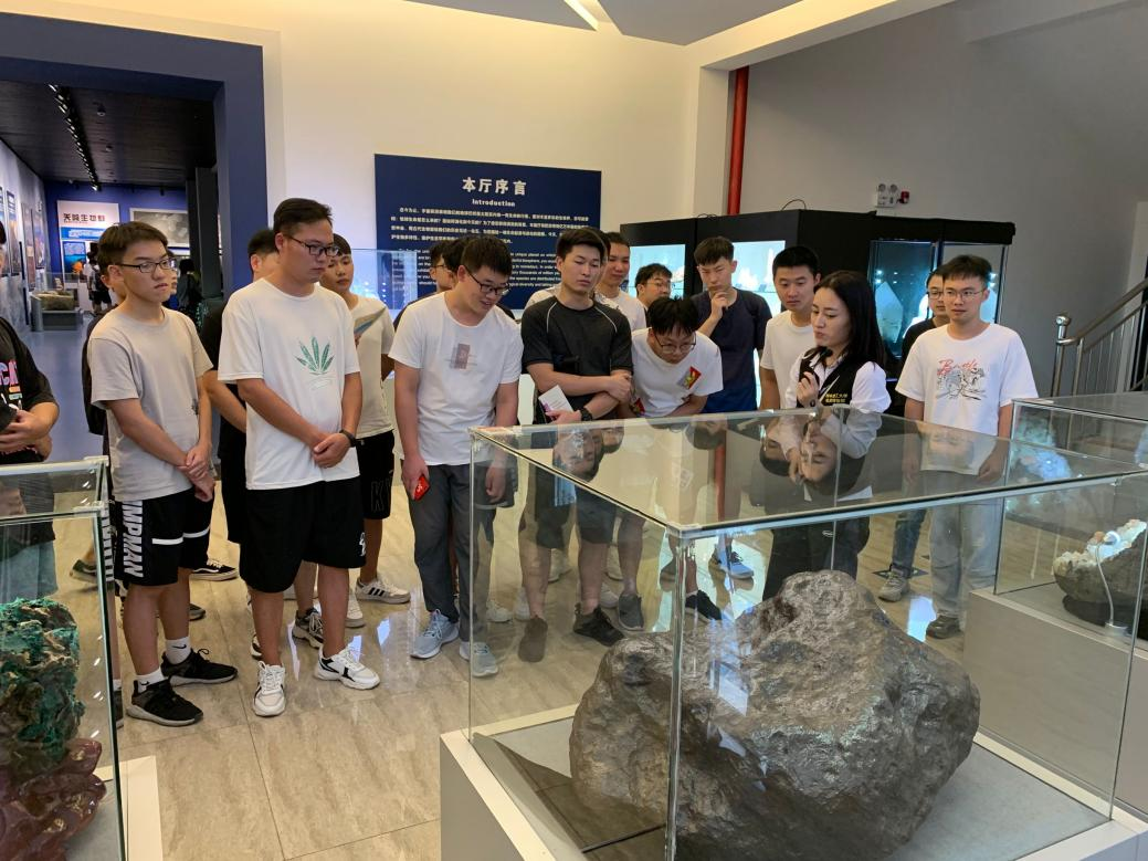 在现场讲解员的带领下,同学们首先参观了各种古生物化石、矿物、岩石、矿石和宝玉石等珍贵标本5000余件,包括长13 m产于贵州关岭的鱼龙化石、重3.5 t的南丹铁陨石、丰富的有色金属矿石及来自南极的岩石标本等。对被誉为“地质历史活的教科书”的金钉子国际地层剖面、天外来客“陨石”、独特的喀斯特岩溶地貌、世界超大型矿床“大厂锡多金属矿”和“平果铝土矿”等专题进行了深入剖析与系统展示。