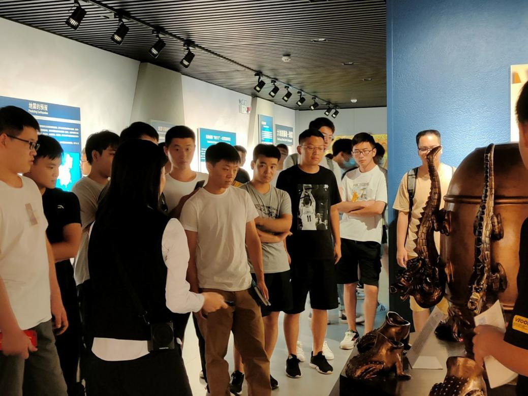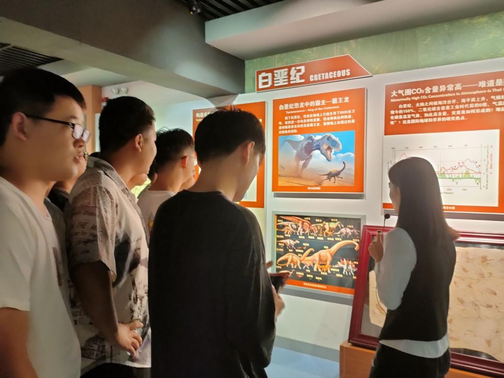 随后,讲解员又带领同学们参观了恐龙图示区和地质勘探区。在恐龙图示区,为同学们讲解了各个时期的各种不同恐龙物种的特点以及恐龙灭亡的经历。在地质勘探区,为同学们介绍了各种地质资源,并对世界上最早的地震预报仪器—候风地动仪以及其他地质相关设备进行了原理和简单构造讲解。