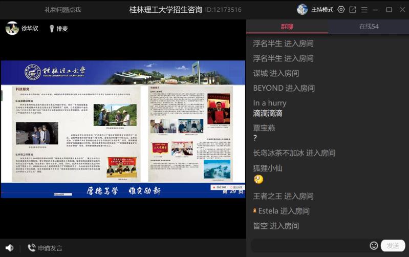 本次活动以宣讲队成员建立的QQ桂林理工大学招生咨询交流群为主要阵地,通过与高中母校老师联系将高三学子拉QQ群,通过QQ的群课堂以QQ直播的形式,首先播放桂林理工大学介绍视频对桂工进行宣传,然后以播放PPT的形式由宣讲团成员更详细介绍桂林理工大学的创立发展历史和招生计划使学弟学妹们更加了解桂工,最后以回答考生关于对桂工招生以及对在桂工的生活学习方面的问题进行详细的回答。