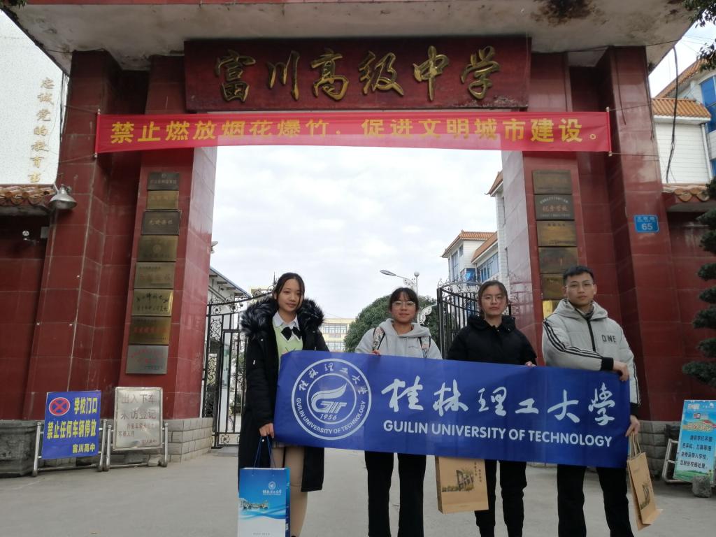 2021年1月19日,桂林理工大学机械与控制工程学院“富川高级中学招生宣传社会实践团”来到富川县高级中学,首先团队成员与昔日的老师取得了联系,说明本次的来意并将宣讲的计划与宣传资料给老师后,老师与学校的领导质询并申请后得到了许可。很幸运的是可以进到了学校进行线下宣讲。