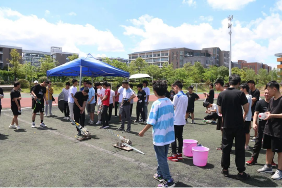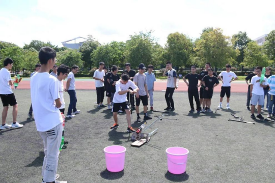 万事俱备,只欠东风。在经过一段时间的等待后,比赛正式开始了。所有参赛选手都蓄势待发,跃跃欲试。参赛人员要将水火箭飞出至少40米远。一支队伍一马当先,首次发射便飞出61米的好成绩。他们的成功彻底点燃了选手们热情,越来越多的选手加入并乐在其中。
