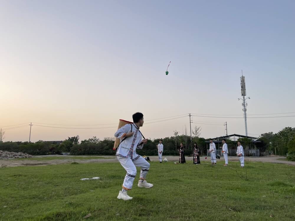绣球为广西壮族特有民俗,乃广西壮家人之定情物和吉祥物,原为壮族青年男女之间的爱情信物。抛绣球一般是在“三月三”歌节时举行,正是春播时节,绣球内填放有谷物种子,就是希望年内“五谷丰登”之意;同时,今天壮家的优秀儿女们,不断为绣球这一古老艺术品注入新的活力,令其在新时代再次散放出璀璨的光芒。看!抛绣球的支部女同学瞄准目标,轻甩绣球,绣球在空中划出一道道美丽的弧线;背篓接球男同学更是聚精会神,他配合着绣球抛出的方向斜侧身子,轻轻微蹲,迅速用背篓接住绣球,精彩的表现赢得了同学们的阵阵掌声。