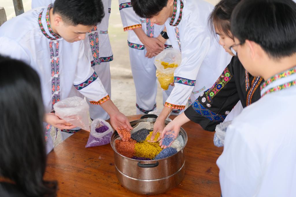 “五彩糯米饭”是壮族地区的传统风味小吃。因糯米饭呈5 种色彩而得名。每年农历 " 三月三 "、清明等节日,壮族群众都喜欢制作 " 五彩糯米饭 "。将糯米放入用红蓝草、黄饭花、枫树叶、洛神花等提取的对人体有益无害的彩色汁液染色,做成五种颜色,再放入蒸笼中蒸熟,艳丽多彩、清香四溢,别有风味。参加活动团员青年共同制作了“五彩糯米饭”,活动现场大家利用颜色不同的米饭进行“作画”,将糯米饭拼出“中国地图”、“自动化”等不同图案,展现了民族的文化魅力。团员青年还深入村民家中向各族人民分享了自制的彩色糯米饭和宣传了民风民俗。