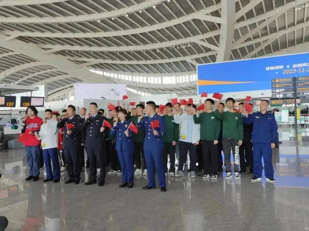 11月21日上午,我院消防车乐队代表我校受邀前往桂林两江国际机场参加“青春快闪,热血消防”主题活动,与消防队队员们激情互动。