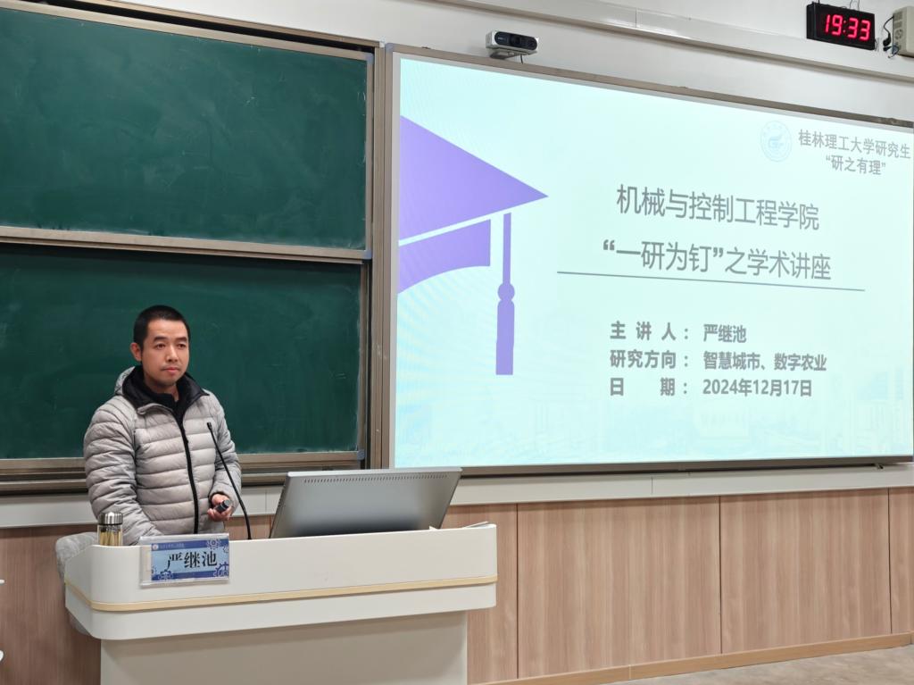 2024年12月17日晚,学院在07118教室举办了桂林理工大学“研之有理”系列活动之“一研为钉”学术讲座,讲座旨在分享科研经验,并为广大研究生提供宝贵的经验指导。活动由学院机电工程实验中心的严继池老师主讲,研究生会种亚军主持,研究生辅导员刘培培及150名在校研究生参与。