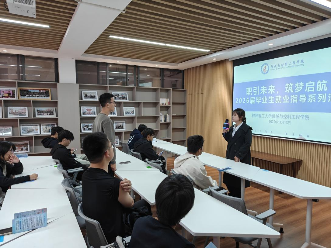 为助力2026届毕业生破解求职难题、实现高质量就业,2025年11月13日15:00,简历面试培训活动在雁山校区25栋一站式学生社区顺利举行。本次活动特邀移远通信杨淑练经理担任主讲人,辅导员罗泽明、王中豪、曹颖颖及毕业年级学生共同参与。