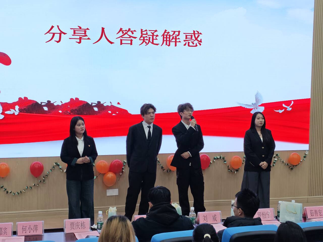活动开始时,主持人介绍了活动的概况、到场嘉宾以及活动流程,随后播放开场视频,深入阐释了“三下乡”的意义。本次共有四支优秀团队分享了他们的实践经历:“科技赋能产业青春筑梦灌阳”实践团扎根桂林灌阳,运用科技力量助力地方产业发展;“桂马丝路行”实践团远赴马来西亚,践行新时代对外开放实践;“语通职场·筑梦未来”实践团立足专业,探索语言技能在职场中的应用价值;寻槐问“道”实践团聚焦乡村振兴,调研桂林全州金槐产业的融合发展路径。分享结束后,现场进行了有奖问答和互动交流环节。观众围绕实践细节、成长收获等方面,踊跃向分享人提问,进一步加深了对“三下乡”活动的认识。