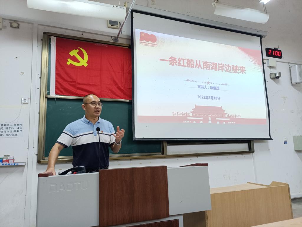为扎实推动党史学习教育深入开展,激励广大学生党员从建党百年的光辉历程中汲取强大精神力量, 5月18日晚上,学院党委书记耿俊茂在07118教室为全体学生党员开展了一场题为“一条红船从南湖岸边驶来”的党史学习教育主题宣讲。