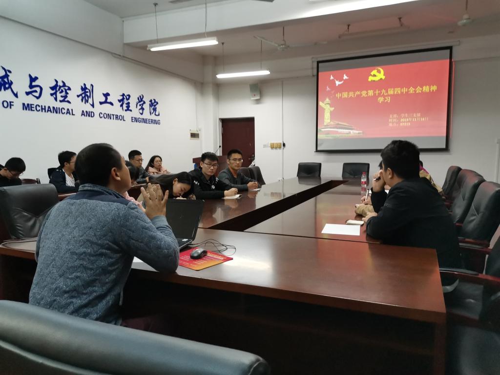 根据学院“不忘初心、牢记使命”主题教育的相关工作要求,11月18日晚,学生第三支部在07215会议室召开党员大会,支部书记韩波老师为全体支部党员上了一堂以“学习十九届四中全会精神”为主题的党课。