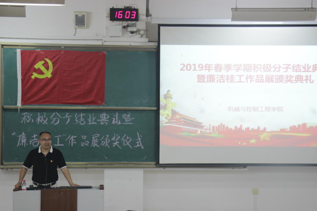 为了深入学习领悟习近平新时代中国特色社会主义思想,不断强化践行“两个维护”思想自觉、政治自觉和行动自觉,树立作为党员、发展对象、积极分子的榜样带头作用,2019年7月2日 15点机械与控制工程学院学生党务中心在05102组织我院春季入党积极分子以及“廉洁桂工”作品获奖者进行结业典礼以及颁奖仪式活动,本次活动由学院党委副书记耿俊茂老师、党务中心于帅帅老师主持。
