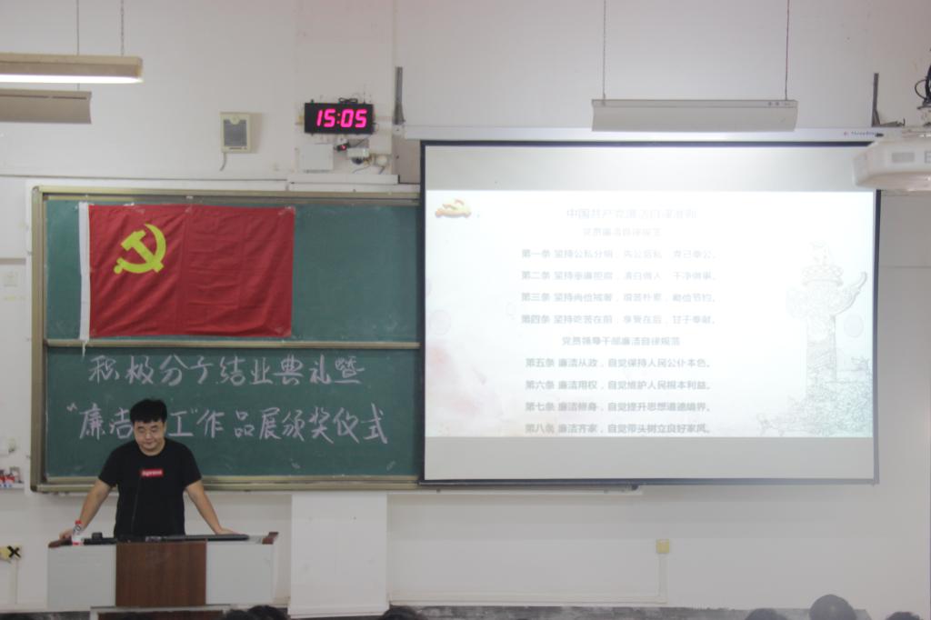 活动开始,首先由于帅帅老师带领同学们进行廉政专题活动讲课学习,学习了解中国共产党廉洁自律准则以及党的领导干部廉洁自律规范,告诉我们要始终把“两个维护”贯穿党风政风监督。“欲看明日之中国,且看今日之校园”这其中便要我们做到要不断完善自身、筑牢根基,以一名党员的规范要求自己,发挥自己的应有的模范带头作用。随即由于帅帅老师为此次在“廉洁桂工”作品展中获奖的同学颁奖并表示祝贺。