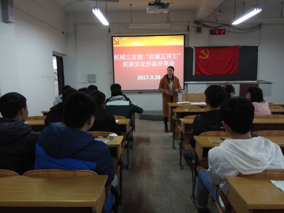 3月28日下午,机械第三党支部在05206开展了《广西“三月三”民族文化、作品分享会》为题的主题党日活动,本次活动以壮族“三月三”弘扬壮族等民族文化精神为主线,用各种丰富多彩的形式让学生党员了解了民族民俗文化知识,培养了学生党员热爱民族的精神,增强文化自信。在本次活动中,各位党员、积极分子纷纷讲述自己家乡的民族传统知识、传承、保护、认识各民族礼仪、过年礼仪、怎么传承民族文化,有些党员、积极分子还饶有兴致地表演了本民族的传统舞蹈、民歌演唱、诗歌朗诵等。