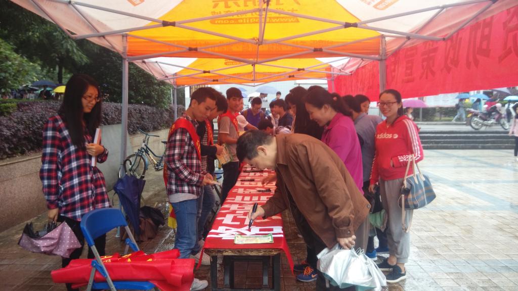 为贯彻落实学校2016年“学生资助政策宣传月”工作方案和深入推进我院“两学一做”学习教育工作进程,充分发挥我院学生党员的先锋模范作用,助力我院开展资助政策宣传,5月24日中午,我院党建办联合奋进社、宿管委于雁山校区1号食堂广场举办国家资助政策宣传及资助诚信签名活动。